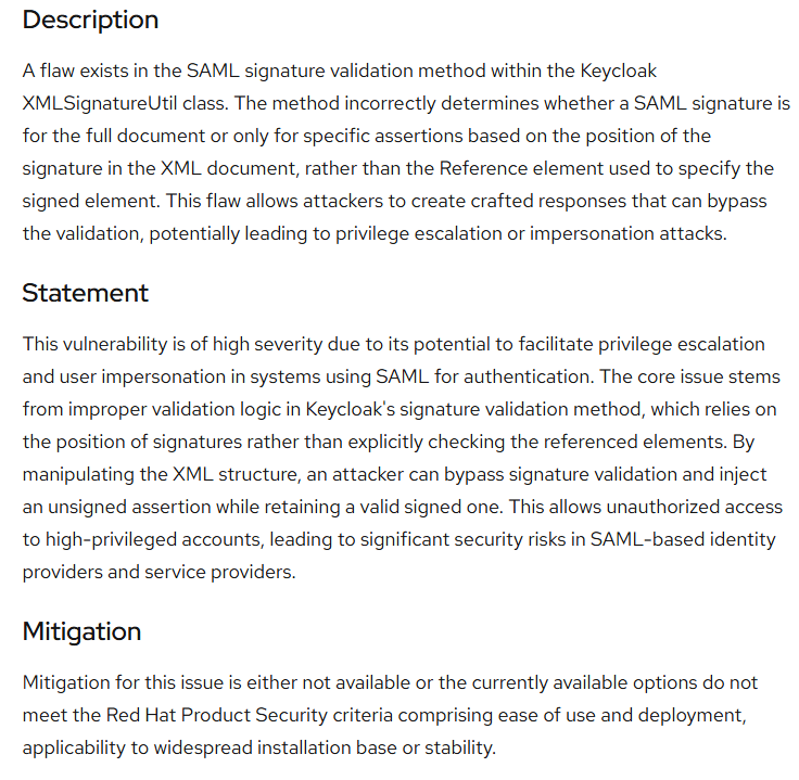 이 취약점은 SAML 인증을 사용하는 시스템에서 권한 상승 및 사용자 사칭을 용이하게 할 수 있는 잠재력으로 인해 심각도가 높습니다. 핵심 문제는 Keycloak의 서명 검증 방법에서 부적절한 검증 논리로 인해 발생하는데, 이는 참조된 요소를 명시적으로 확인하는 대신 서명의 위치에 의존합니다. 공격자는 XML 구조를 조작하여 서명 검증을 우회하고 유효한 서명된 어설션을 유지하면서 서명되지 않은 어설션을 삽입할 수 있습니다. 이를 통해 권한이 높은 계정에 대한 무단 액세스가 허용되어 SAML 기반 ID 공급자 및 서비스 공급자에게 심각한 보안 위험이 발생합니다.