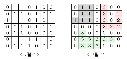<그림 1>과 같이 정사각형 모양의 지도가 있다. 1은 집이 있는 곳을, 0은 집이 없는 곳을 나타낸다. 철수는 이 지도를 가지고 연결된 집들의 모임인 단지를 정의하고, 단지에 번호를 붙이려 한다. 여기서 연결되었다는 것은 어떤 집이 좌우, 혹은 아래위로 다른 집이 있는 경우를 말한다. 대각선상에 집이 있는 경우는 연결된 것이 아니다. <그림 2>는 <그림 1>을 단지별로 번호를 붙인 것이다. 지도를 입력하여 단지수를 출력하고, 각 단지에 속하는 집의 수